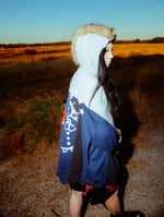 One of One Up-cycled mashup Hoodie using second hand materials only, featuring faux fur hood and sleeves, screen printed vintage / y2k hoodies mashed together to make one, adidas track pants as sleeves and more.