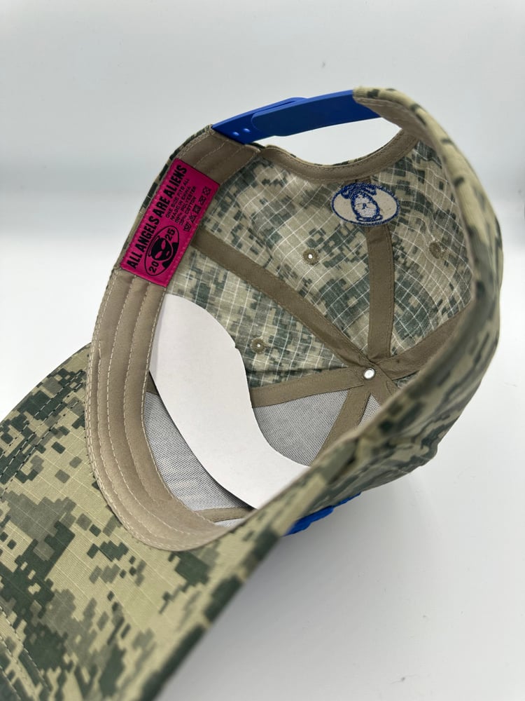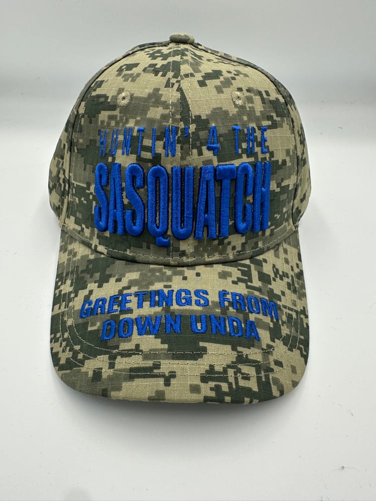 Digi camo hat with ‘sasquatch’ embroidery front panel, brim and back. Custom Woven labels on the inside.