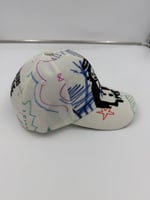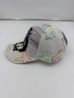 Produced in super small batches (only 10 made), this is the new angel hat design using Real Tree camo in the bottom brim, and upcycled 100% cotton white denim fabric with hand drawn designs all over from my first art show, by ALL ANGELS ARE ALIENS.