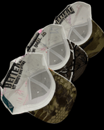 Produced in super small batches (only 10 made), this is the new hugging hat design using Real Tree camo in the bottom brim, and upcycled 100% cotton white denim fabric with hand drawn designs all over from my first art show, by ALL ANGELS ARE ALIENS.