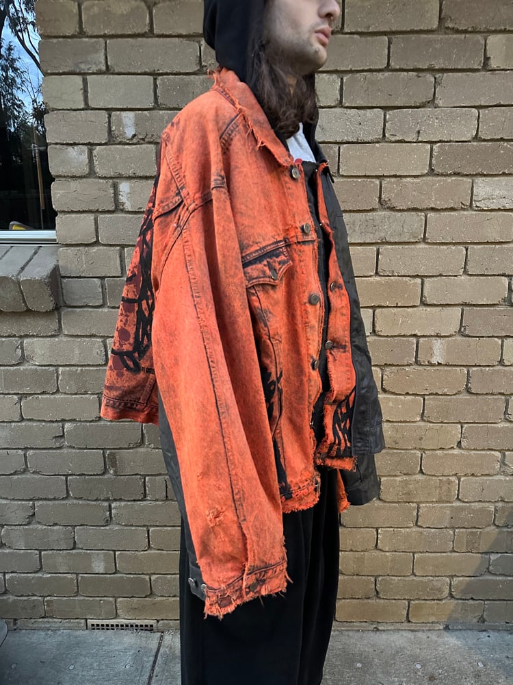 FULLY up-cycled vintage Dyed denim levis jacket and harley davidson waxed denim jacket, repaired, dyed, screen printed and sewn