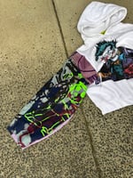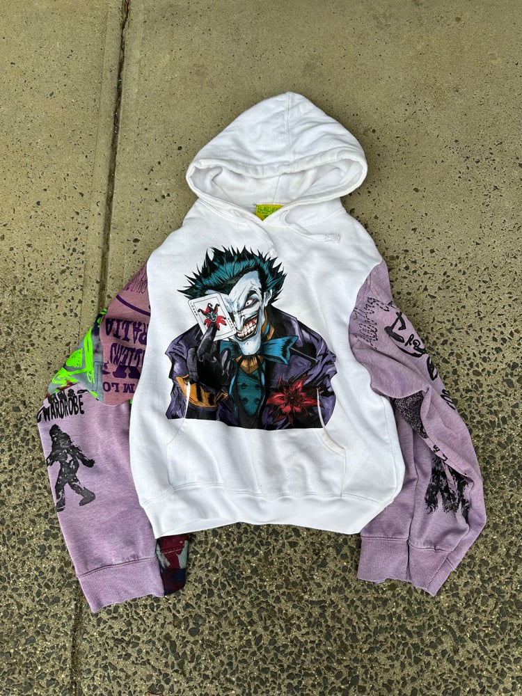 Up-cycled JOKER DC WHITE HOODIE with screen printed AAAA designs on back and upcycled AAAA crewnecks as the sleeves.