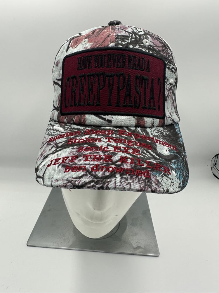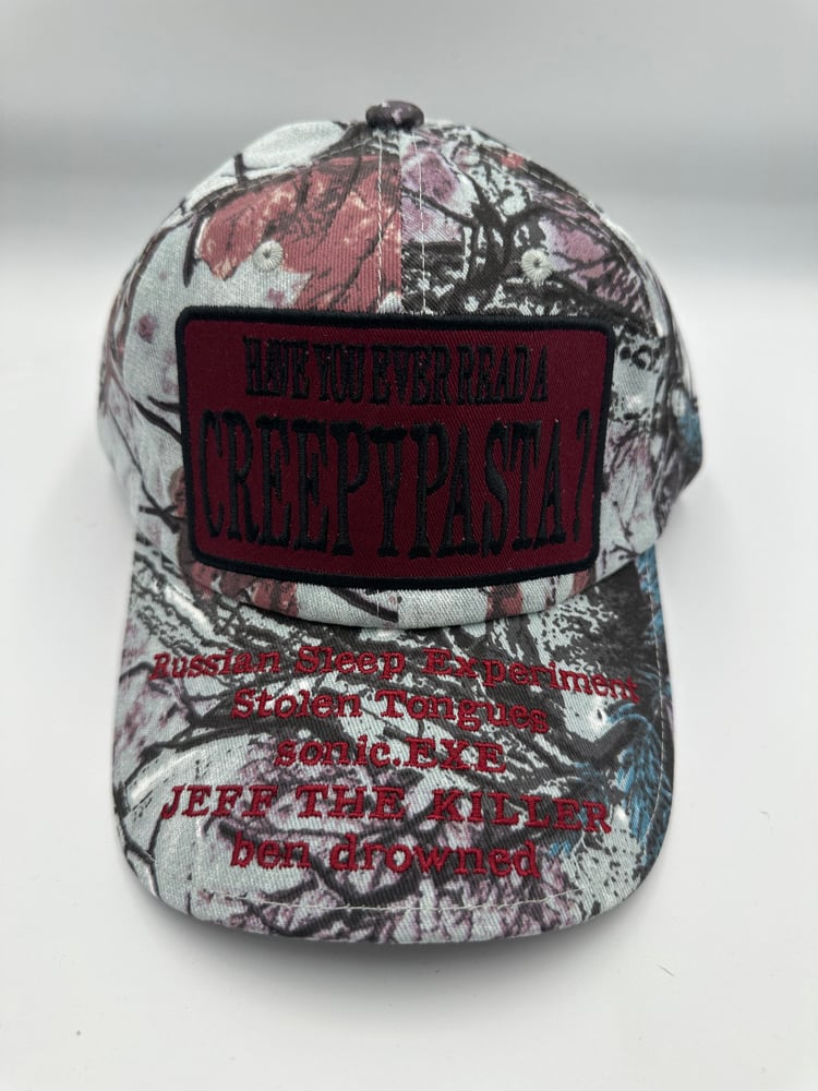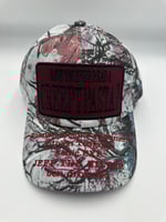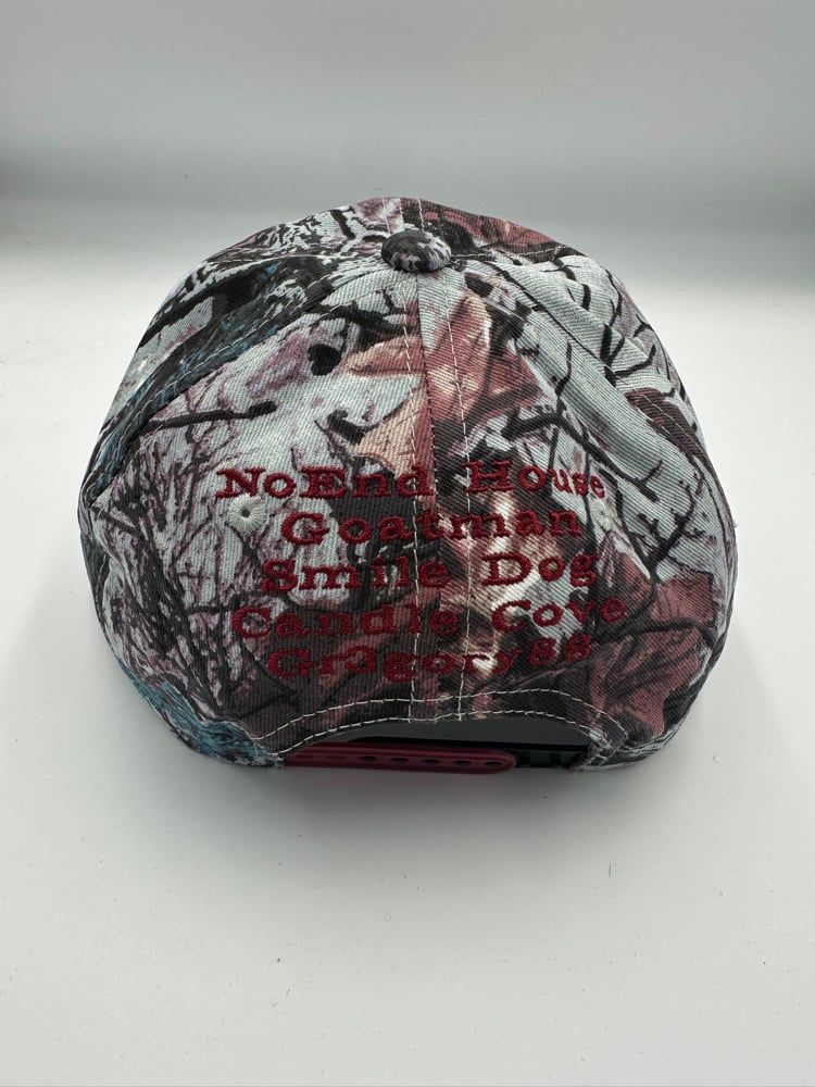Real tree camo hat with ‘mothman’ embroidery front panel, brim and back. Custom Woven labels on the inside.