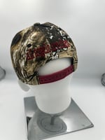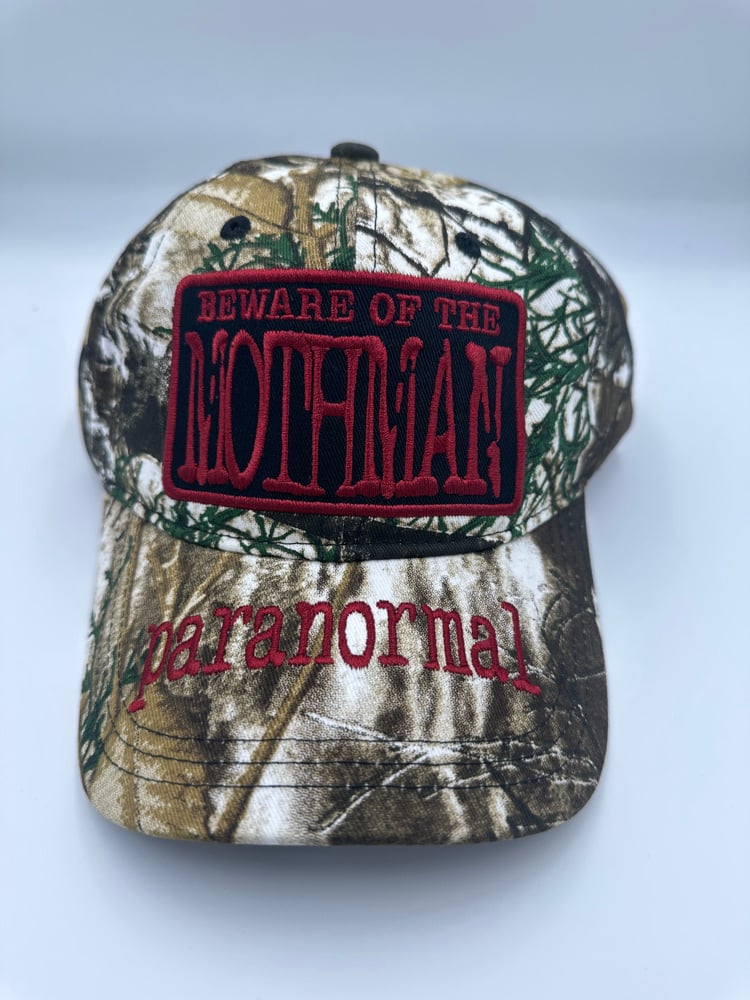 real tree camo hat with ‘MOTHMAN’ embroidery front panel, brim and back. Custom Woven labels on the inside.