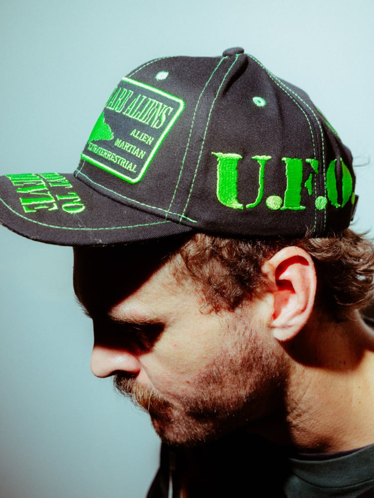 • UFO lime green embroidery on front, embroidery also on brim, sides, and back