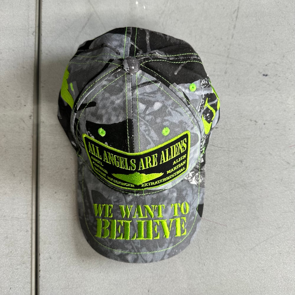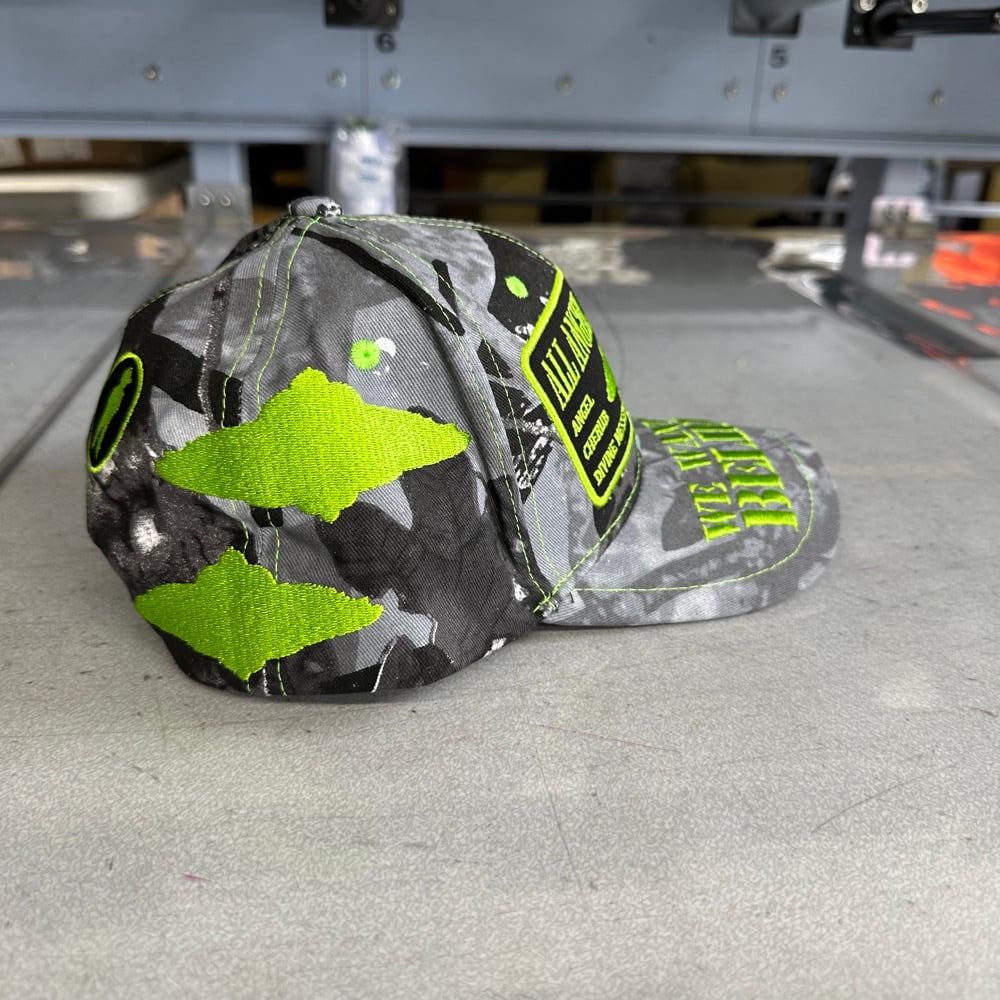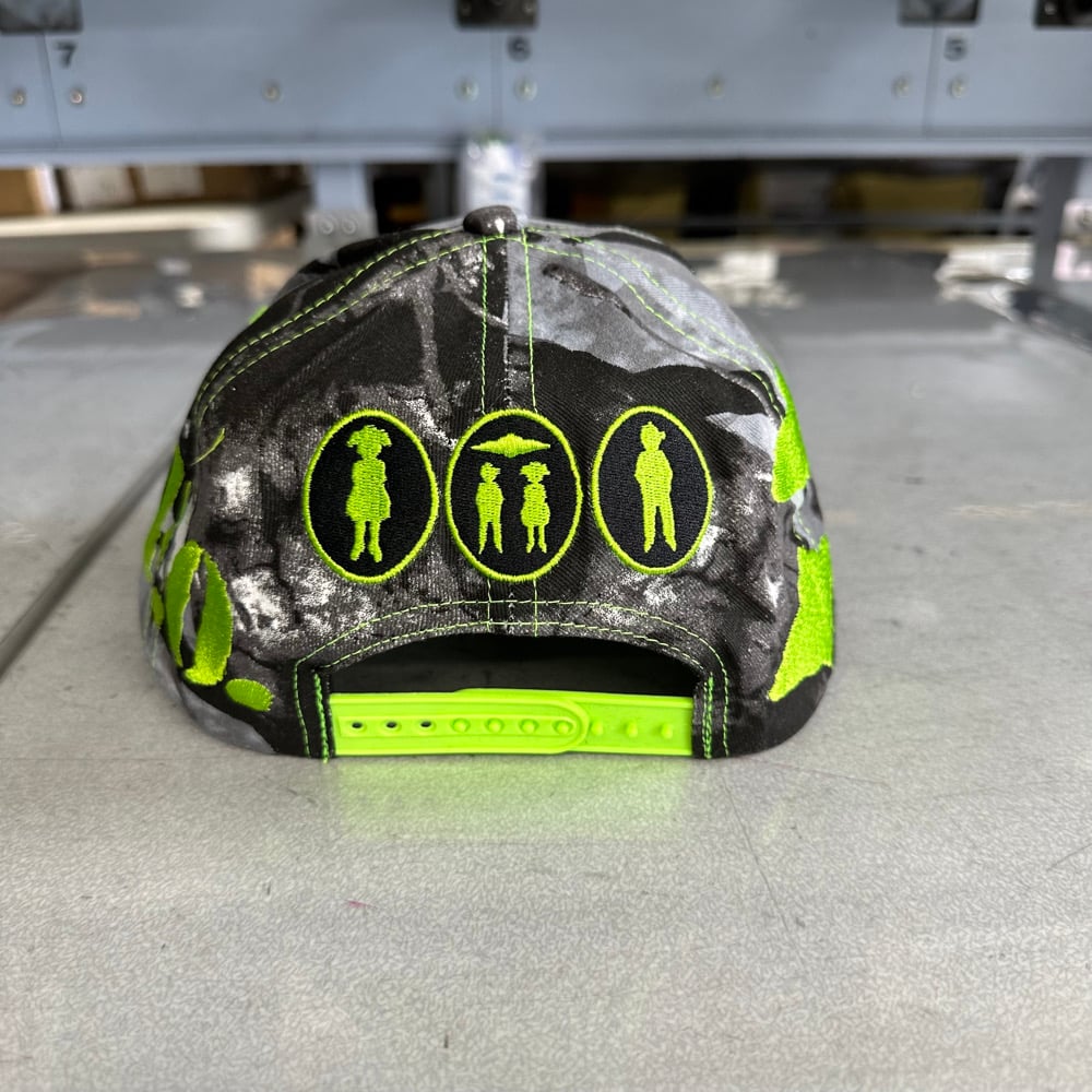 Real tree camo hat with ‘UFO’ embroidery front panel, brim and back. Custom Woven labels on the inside.