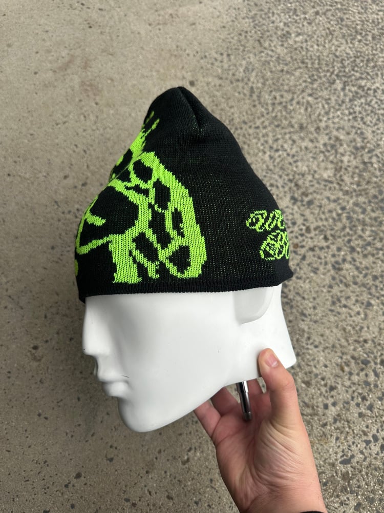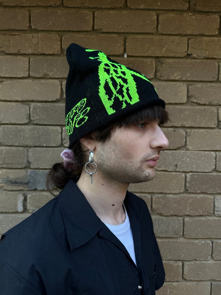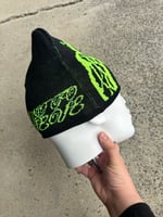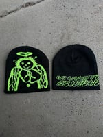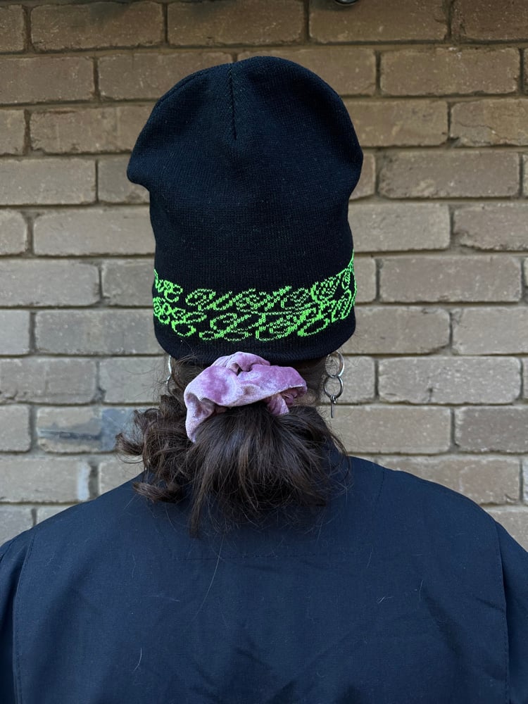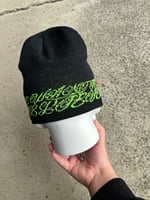 black beanie with woven ANGEL in neon green on one side and WE WANT TO BELIEVE in cursive in neon green on the other side