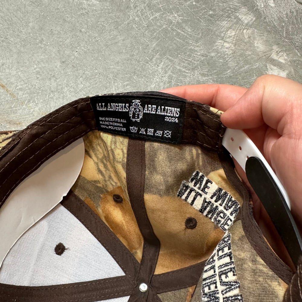real tree camo hat with ‘YOWIE’ embroidery front panel, brim and back. Custom Woven labels on the inside.